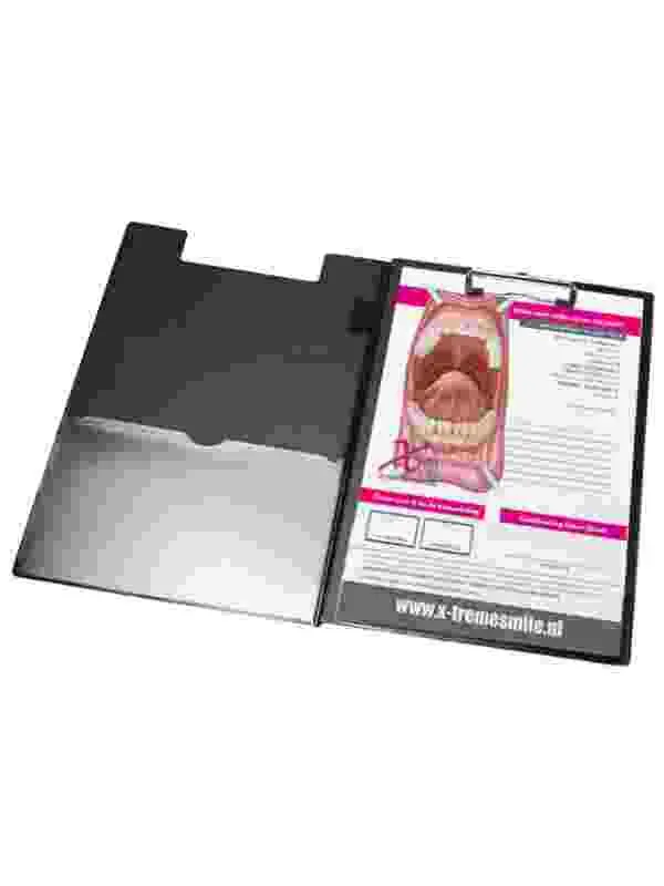 De X-treme Smile® schrijfmap voor intakeformulieren is ideaal wanneer u of uw klant het intakeformulier invult. Altijd een harde ondergrond, ruimte voor een pen en ruimte voor notitieblaadjes. Dankzij de handige clip wordt het intakeformulier op zijn plaats gehouden.