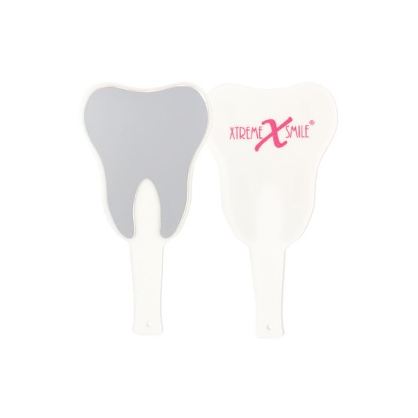 Prachtige handspiegel in de vorm van een tand of kies. De spiegel is een tandvorm en beschikt op de achterkant over ons logo. Leuk voor in een tandartspraktijk.