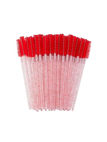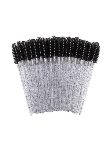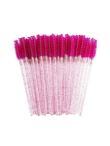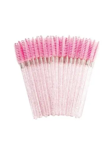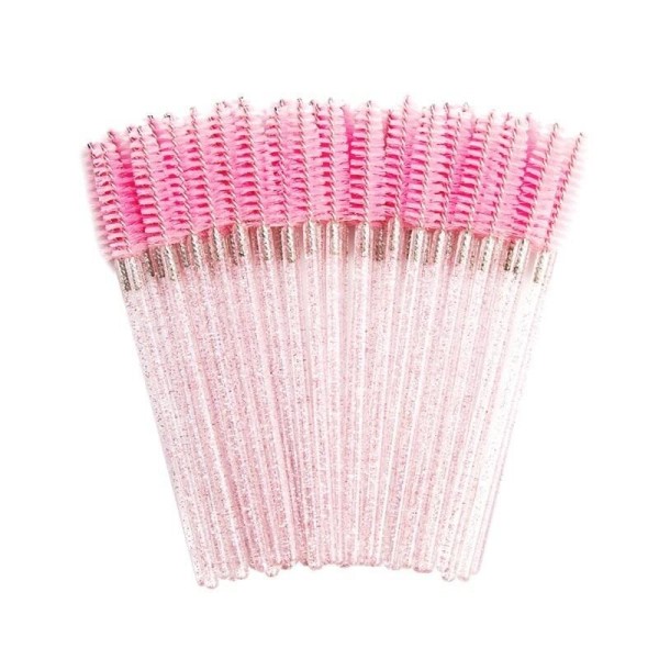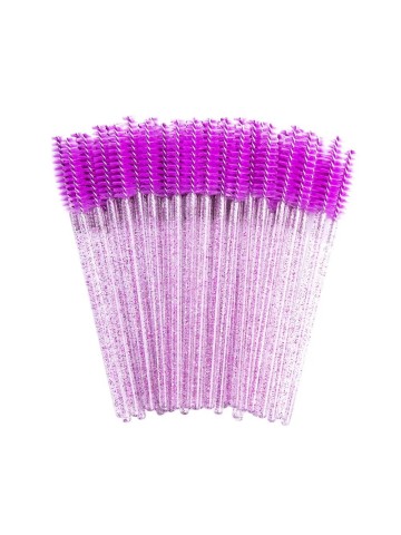 Wimperborsteltjes met paars roze glitters. Geef na het plaatsen van een set wimperextensions altijd een wimperborsteltje / mascaraborstel mee aan de klant. Voor de hygiëne is het belangrijk om bij elke klant een nieuw wimperborsteltje te gebruiken. Thuis kan de klant de wimpers weer in model borstelen en zo de juiste zorg geven aan de extensions.