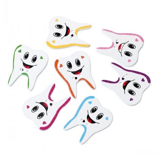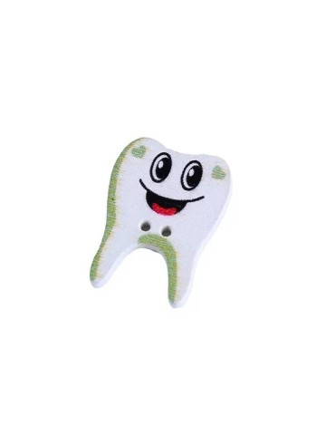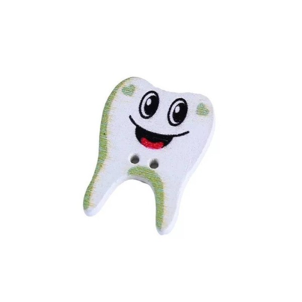 Knopen in de vorm van een tand. Een zakje met 5 houten knopen in de vorm van een tand/kies. De knopen hebben 2 naaigaatjes.