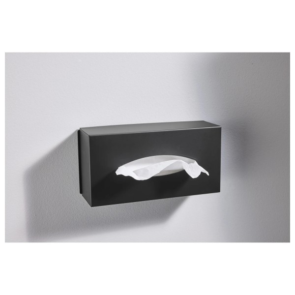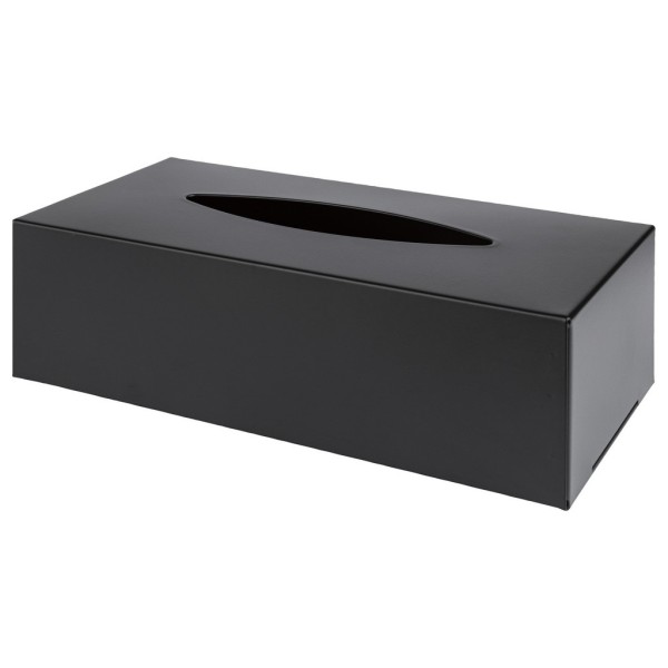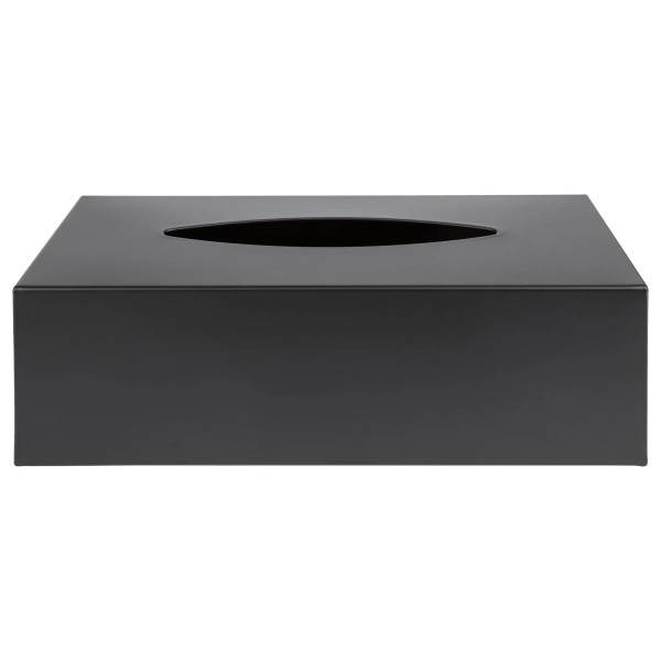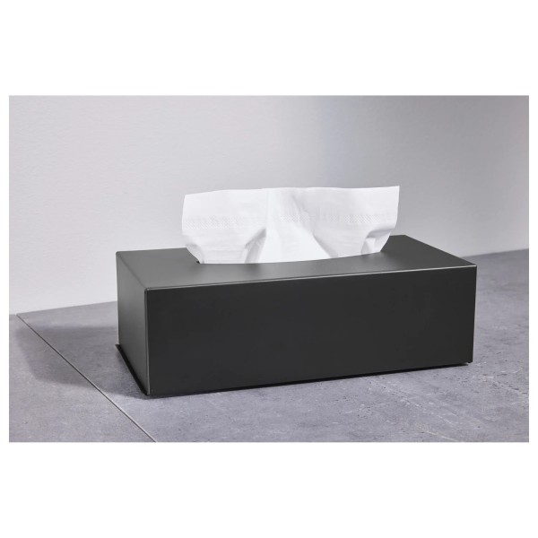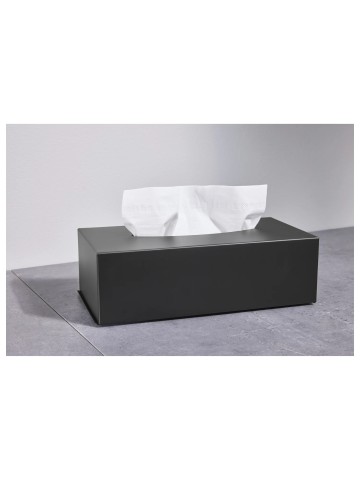 Tissue Dispenser Zwart Metaal met een deksel aan de onderkant voor het verwisselen van de tissuedoos. Geschikt voor cosmetische tissues.