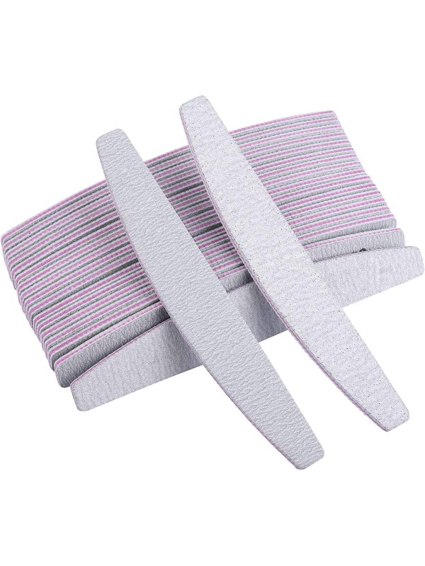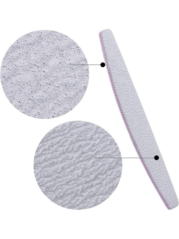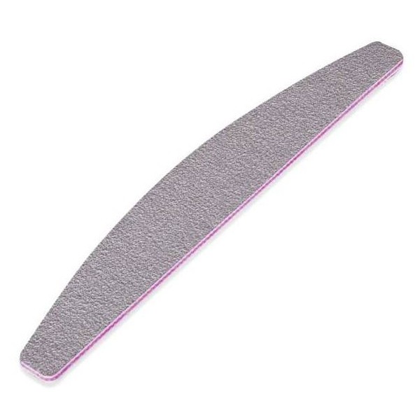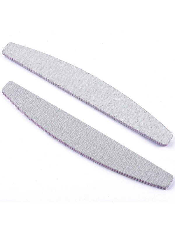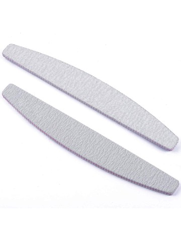 Halvemaan moon nagelvijlen met grit 100/180. De nagelstylist kan met de grovere kant de acryl of gel vijlen om de nagel vorm te geven en met de fijnere korrel de eigen nagel opruwen, zodat de kunstnagel beter houdt op de natuurlijke nagel.