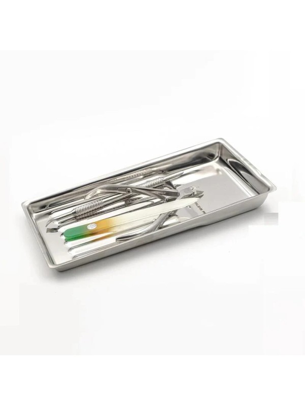 Instrumenten Tray van roestvrijstaal (RVS) voor zowel de pedicure als de schoonheidsspecialist. Leg je instrumenten netjes klaar om zo vlot met je behandeling te kunnen beginnen. Het instrumentenschaaltje kun je makkelijk desinfecteren en reinigen. Door de perfecte maat past al jouw gereedschap keurig netjes in de instrumententray.