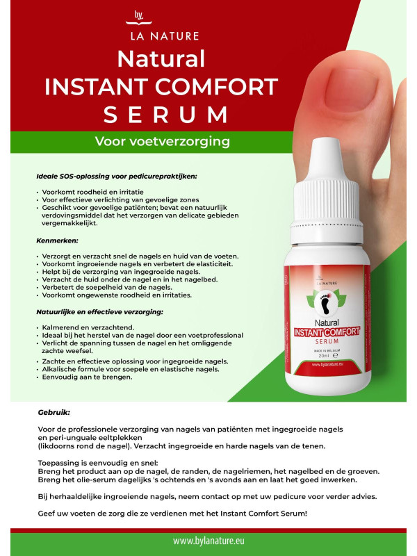 By La Nature SOS Instant Comfort Serum is een natuurlijk verdovend middel om snel verlichting te geven bij roodheid en irritatie door bijvoorbeeld ingegroeide teennagels. Dit nieuwe product voorkomt ook het ingroeien van teennagels, doordat het de huid rondom de nagels flexibel, elastisch en soepel houdt. Daarnaast is het product ook geschikt voor peri-unguale eeltplekken (likdoorns rond de nagel).