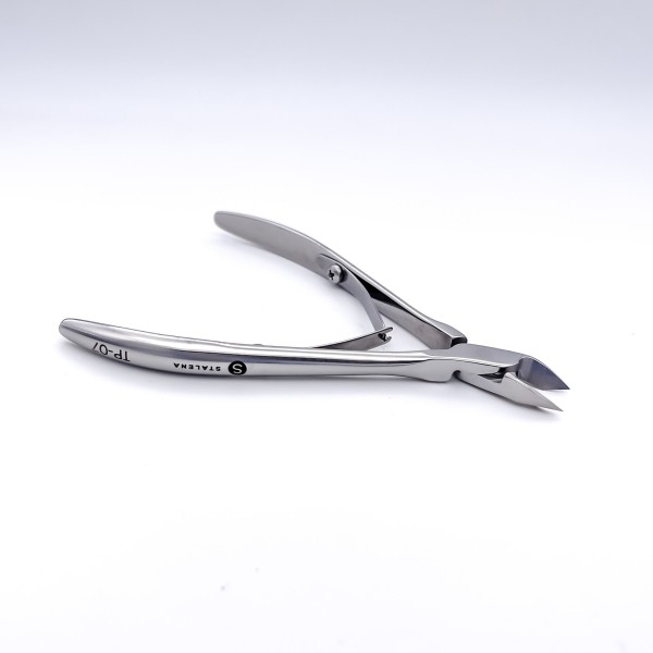 De vellentang TP-07 is een vellentang met een lange handgreep. Je hebt met deze tang perfect zicht, omdat de bek verlengd is en er een inkeping rond het scharnierpunt zit. Dit is een van de meest populaire Stalena tangen en mag niet missen in jouw pedicure instrumenten verzameling. Deze vellentang wordt met name gebruikt voor het verwijderen van (opstaande) eelt randen, hyperkeratosen, nagelriemen en los zittende stukjes huid. De TP-07 is de verbeterde versie van de KE-03 en daarom kun je hem eenvoudiger schoon houden / onderhouden.
