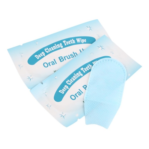 Oral Brush Vinger poetsdoekjes 25 st. voor het schoonpoetsen van de tanden. Soms worden deze vingerpoetsdoekjes ook gebruikt om de voorbehandelspray mee in te poetsen.