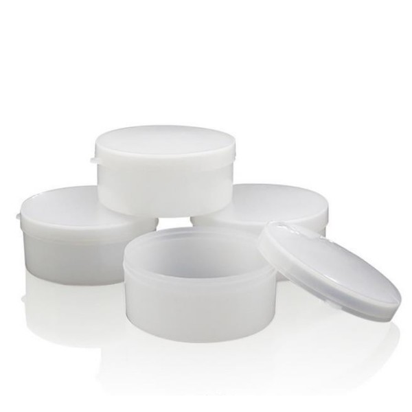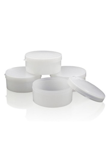 Lege zalf monster potjes van plastic met stevige klik drukdeksel.